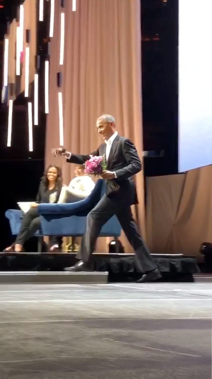 The previous president strolled onto the phase with a bundle of blossoms for his significant other, who’s advancing her new diary, Becoming, and the group went crazy.
